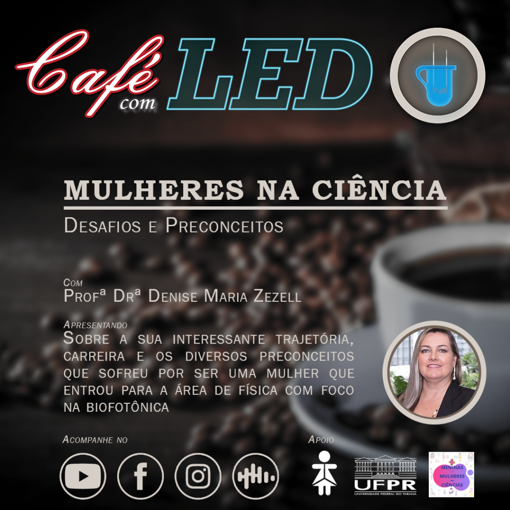 O UFPR Student Chapter traz o primeiro episódio do Café com LED, um Podcast gravado com a participação especial da Professora Doutora Denise Maria Zezell, sobre a sua interessante trajetória contando sobre sua carreira e os diversos preconceitos que sofreu por ser uma Mulher que entrou para a área de FÃsica com foco na Biologia (Biofotônica).